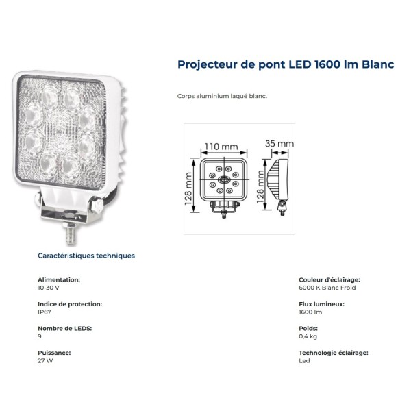 PROJECTEUR LED 18W 3100Lux @ 1M, IP67, 9~32V ULTRA PUISSANT